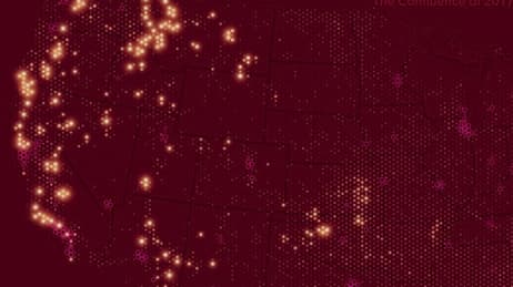 Animated data really makes this map work. It draws focus beyond individual circles to the aggregate effect of circles synchronizing, blooming, and changing in waves. Just as when we watch a flock of birds, we no longer see individual birds. We abstract them into a simpler, larger visual object—a flock. With animated maps, hundreds of disparate symbols become a single, organic shape that shows both location and rate of change. This map is a great example of how animation can clarify a complicated dataset and nuance our understanding of geographic processes playing out over space and time.